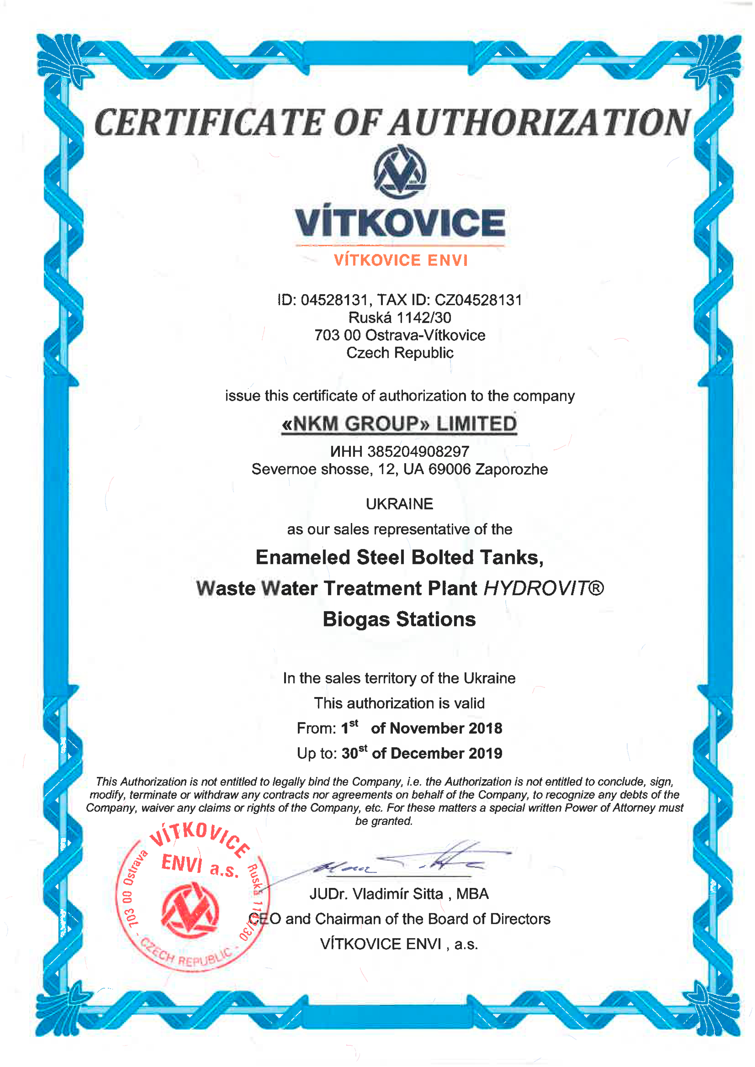 - партнером компанії «VITKOVICE» (Чехія) (біогазові станції, очисні споруди, резервуари),