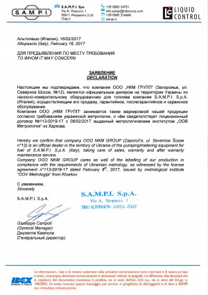 - представником компанії «SAMPI / LIQUID CONTROLS Europe» (Італія) (високоточкові лічильники та витратоміри палива та інших рідин, клапани, помпи),